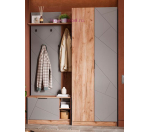 Небольшая прихожая шириной 80 см представляет собой вешалку с тумбой. Вешалка с 5 крючками для одежды и полкой, тумба с откидной дверцей и открытыми полками для хранения обуви и аксессуаров. Прихожая может быть дополнена шкафами Орегон в том же цвете. Прихожая выпускается в двух цветовых сочетаниях: с фасадом в цвете асфальт и с белым фасадом. Фасады из МДФ с матовым покрытием и фрезеровкой в виде ассиметричных линий.