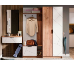 Небольшая прихожая шириной 80 см представляет собой вешалку с тумбой. Вешалка с 5 крючками для одежды и полкой, тумба с откидной дверцей и открытыми полками для хранения обуви и аксессуаров. Прихожая может быть дополнена шкафами Орегон в том же цвете. Прихожая выпускается в двух цветовых сочетаниях: с фасадом в цвете асфальт и с белым фасадом. Фасады из МДФ с матовым покрытием и фрезеровкой в виде ассиметричных линий.