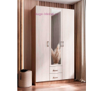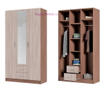 Недорогой трехдверный шкаф с выдвижными ящиками и зеркалом. Внутри шкафа три секции: два отделения со штангой и отделение с полками в центре. Шкаф выпускается в двух сочетаниях цветов: венге/дуб и ясень светлый/темный. Современный и недорогой распашной шкаф подойдет и для прихожей и для спальни.