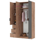 Современный 3-х створчатый шкаф с зеркалом и тремя выдвижными ящиками. Шкаф для одежды шириной 120 см с двумя отделениями внутри: отсек шириной 76 см со штангой для одежды и антресольной полкой и отделение с двумя полками шириной 38 см с тремя выдвижными ящиками внизу. Фасады с оригинальной фрезеровкой из МДФ с качественным матовым покрытием серого цвета, корпус под дерево в цвете дуб крафт табачный.