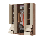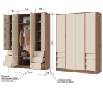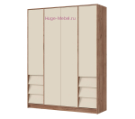 Четырехстворчатый распашной шкаф шириной 160 см с 6 выдвижными ящиками. Внутри этого вместительного шкафа три отделениями: два отсека с полками шириной 38 см с ящиками внизу и центральное отделение со штангой для одежды шириной 76 см и двумя полками. Шкаф без зеркал с гармоничным сочетаем светлого сливочного оттенка кашемир и декора под дерево отлично впишется в любой современный интерьер. Шкафы Рейн без лицевой фурнитуры: наклонные фасады выдвижных ящиков не только стильное решение, но и удобны для захвата, а створки шкафа открываются нажатием.